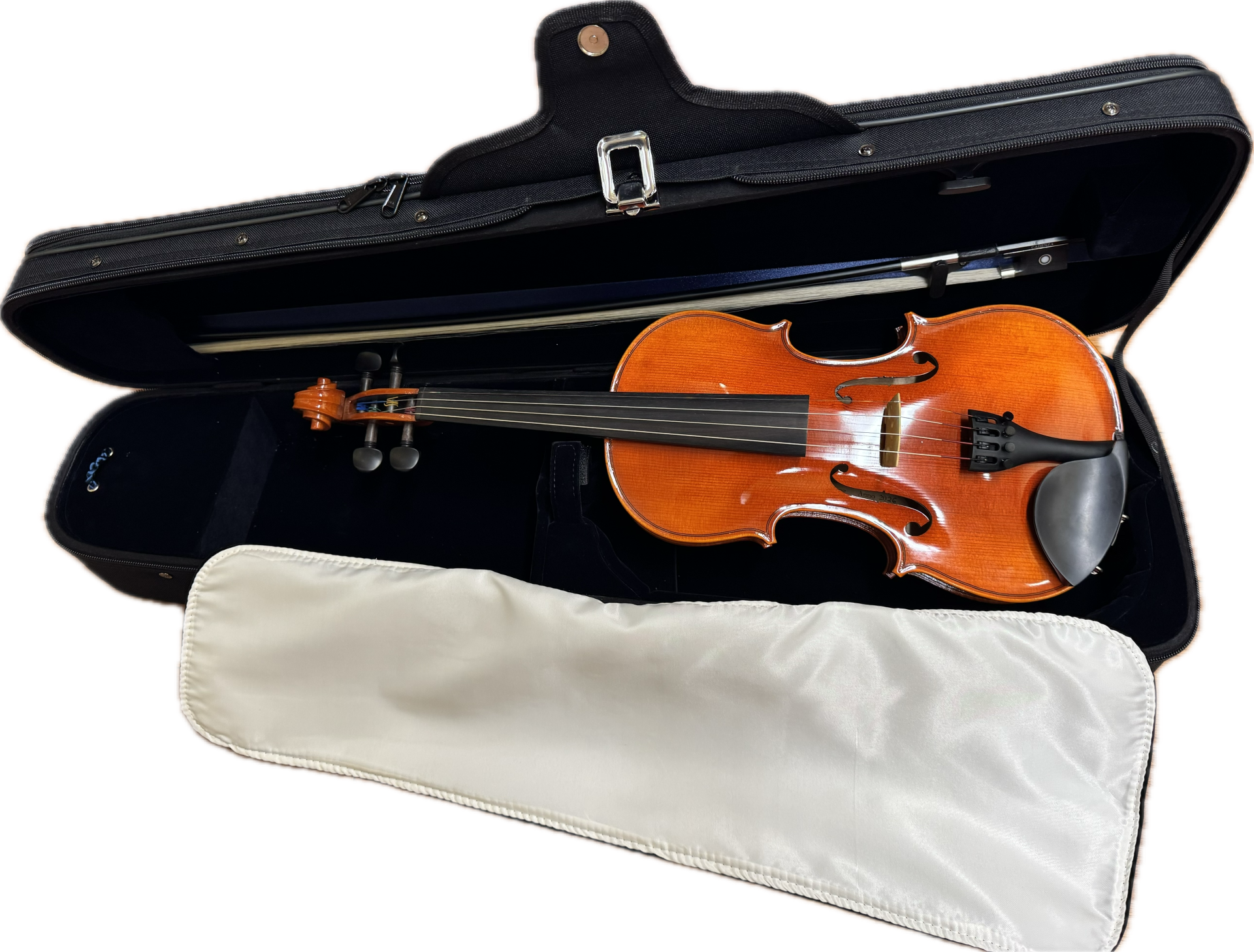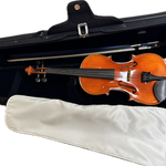 The Geoffrey Chi Conservatory violin outfit has an excellent, rich sound, is easy to play, and has very fine projection. Handcrafted of select, seasoned tonewoods with an ebony fingerboard and fittings, these instruments have remarkable tonal quality and matching workmanship. A great beginner instrument, your student won't have to compensate with bad habits and technique. The finish is nicely flamed maple with a hand-applied satin varnish.